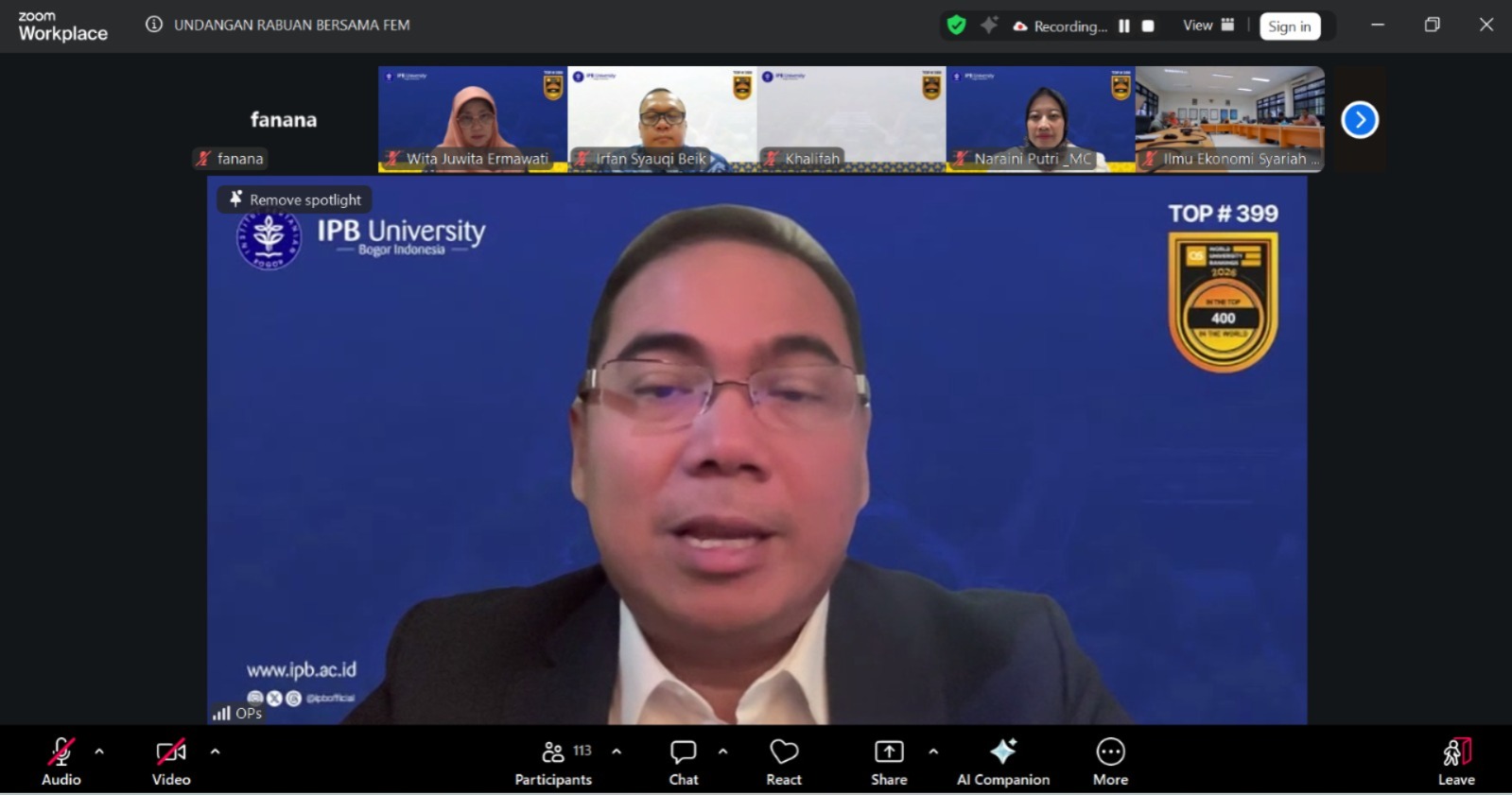 Fakultas Ekonomi dan Manajemen (FEM) IPB University menyelenggarakan kegiatan Rabuan Bersama FEM pada Rabu, 28 Januari 2026, pukul 10.00–12.00 WIB, yang dilaksanakan secara daring melalui ruang meeting Zoom. Kegiatan ini dihadiri oleh Rektor IPB University, pimpinan fakultas, dosen, serta sivitas akademika FEM sebagai forum strategis untuk membahas kinerja fakultas dan arah pengembangan ke depan.