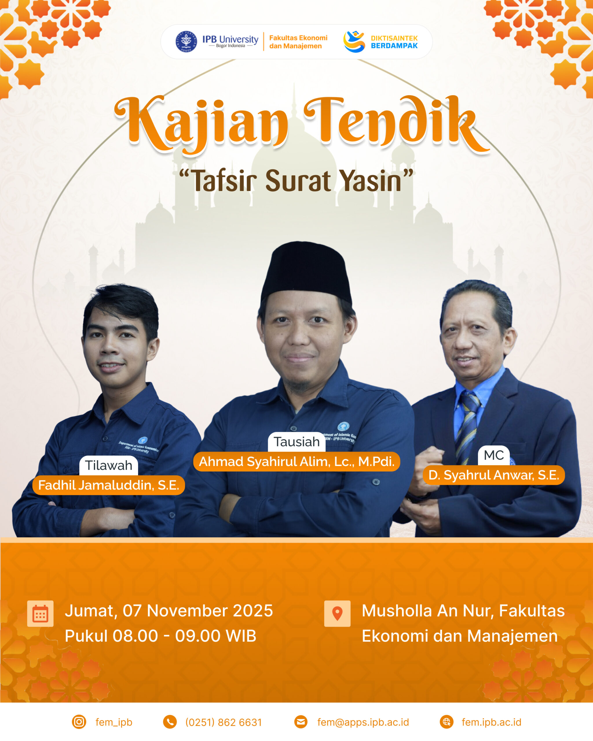Tenaga Kependidikan (Tendik) Fakultas Ekonomi dan Manajemen (FEM) IPB University kembali melaksanakan kegiatan pengajian mingguan sebagai bagian dari upaya meningkatkan keimanan dan mempererat silaturahmi antarpegawai. Kegiatan yang berlangsung di Mushola An-Nur FEM, ini mengangkat tema “Tafsir Surat Yasin” bersama narasumber Ustaz Ahmad Syahirul Alim, Lc., M.Pd.I. Dalam ceramahnya, Ustaz Ahmad Syahirul Alim menjelaskan makna mendalam…